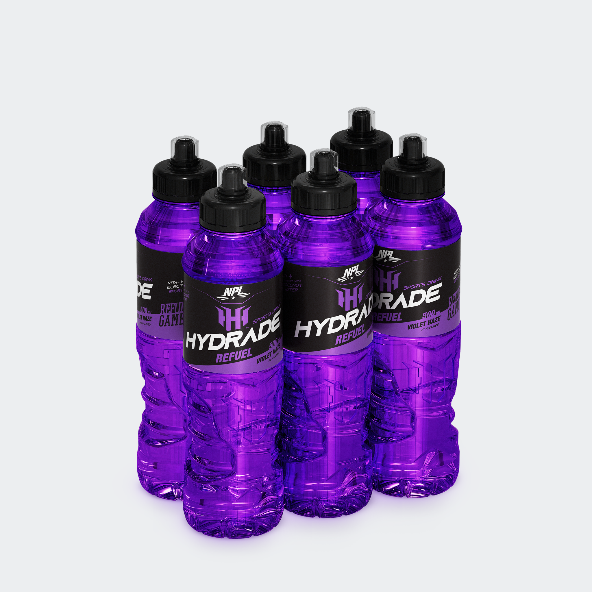 Pack de 6 bouteilles Hydrade Violet Haze 500ml. Boisson isotonique avec eau de coco, 12 vitamines & électrolytes. Goût raisin violet original.