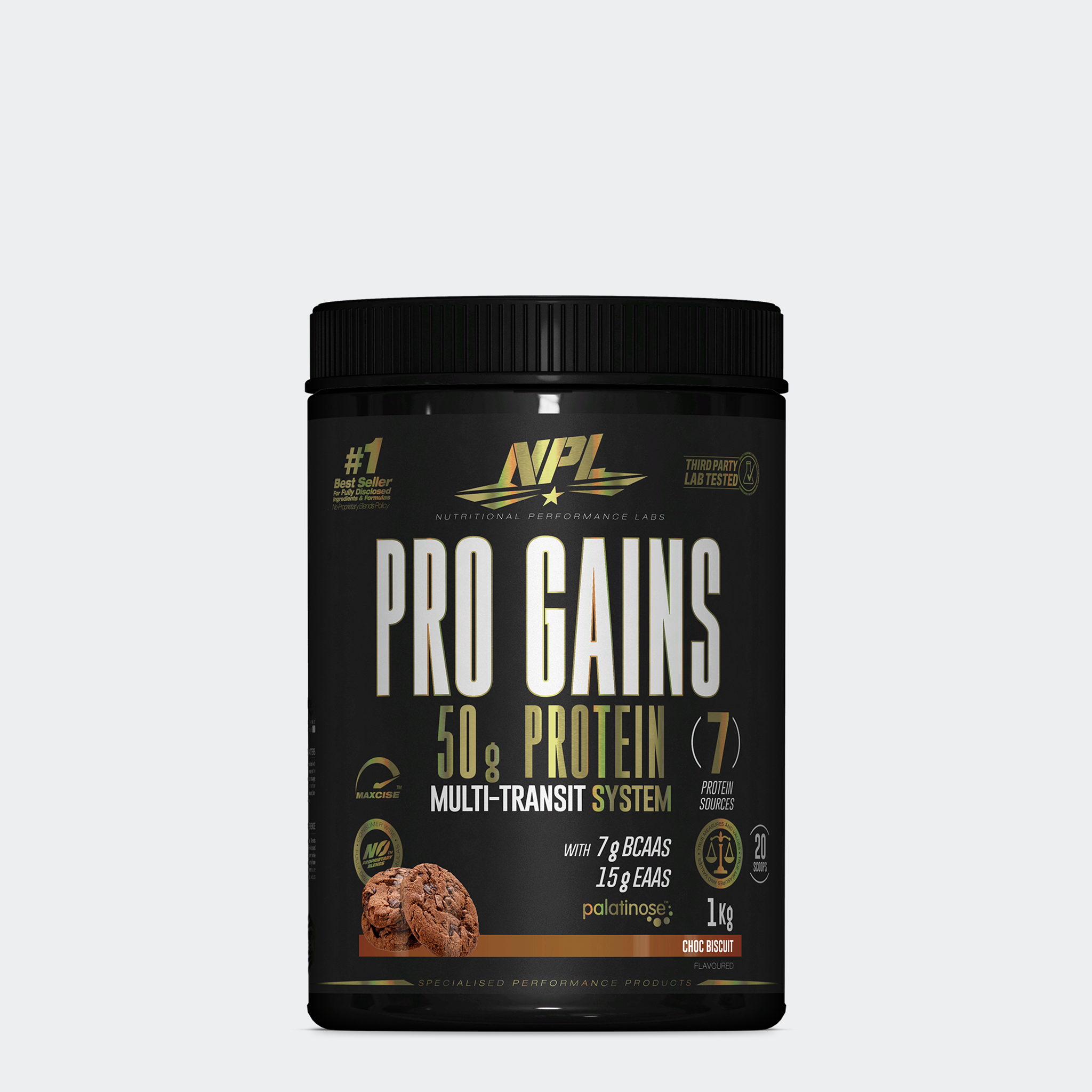 Mass gainer premium NPL Pro Gains 4 Kg avec 50g de protéines (7 sources) et 82g de glucides par dose. Multi-Transit System pour une libération prolongée. 7g BCAA + 15g EAA.
